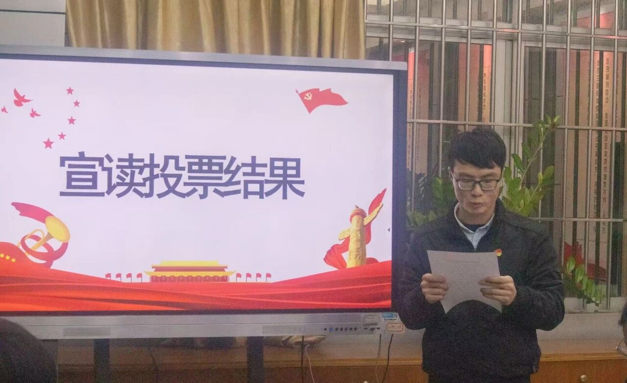 大会第三项议程,全体参会正式党员以无记名投票方式表决,投票结束后,由计票人邱宏波老师和监票人辜伟佳老师统计票数并宣读党支部决议,大会一致同意接收两人为中共预备党员。