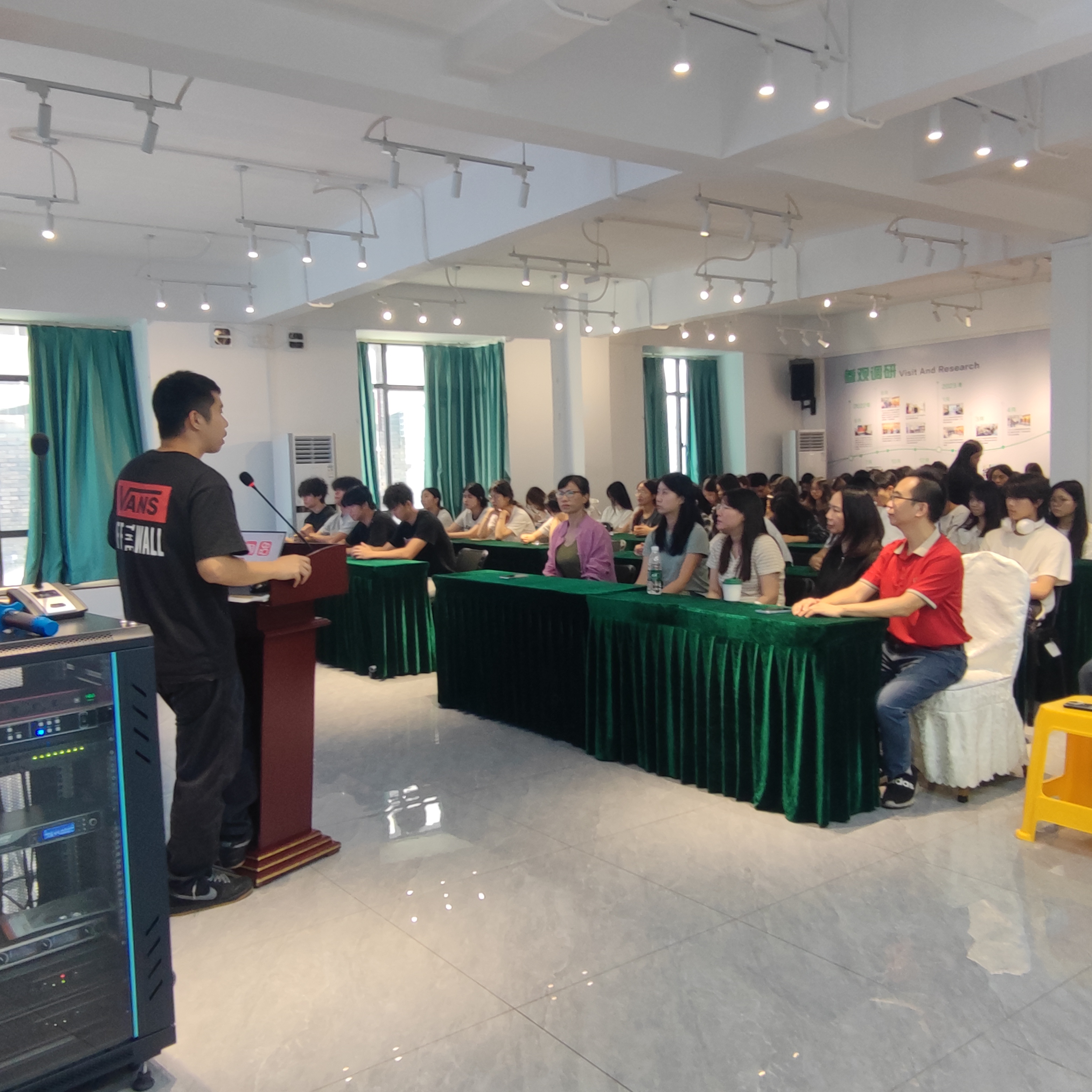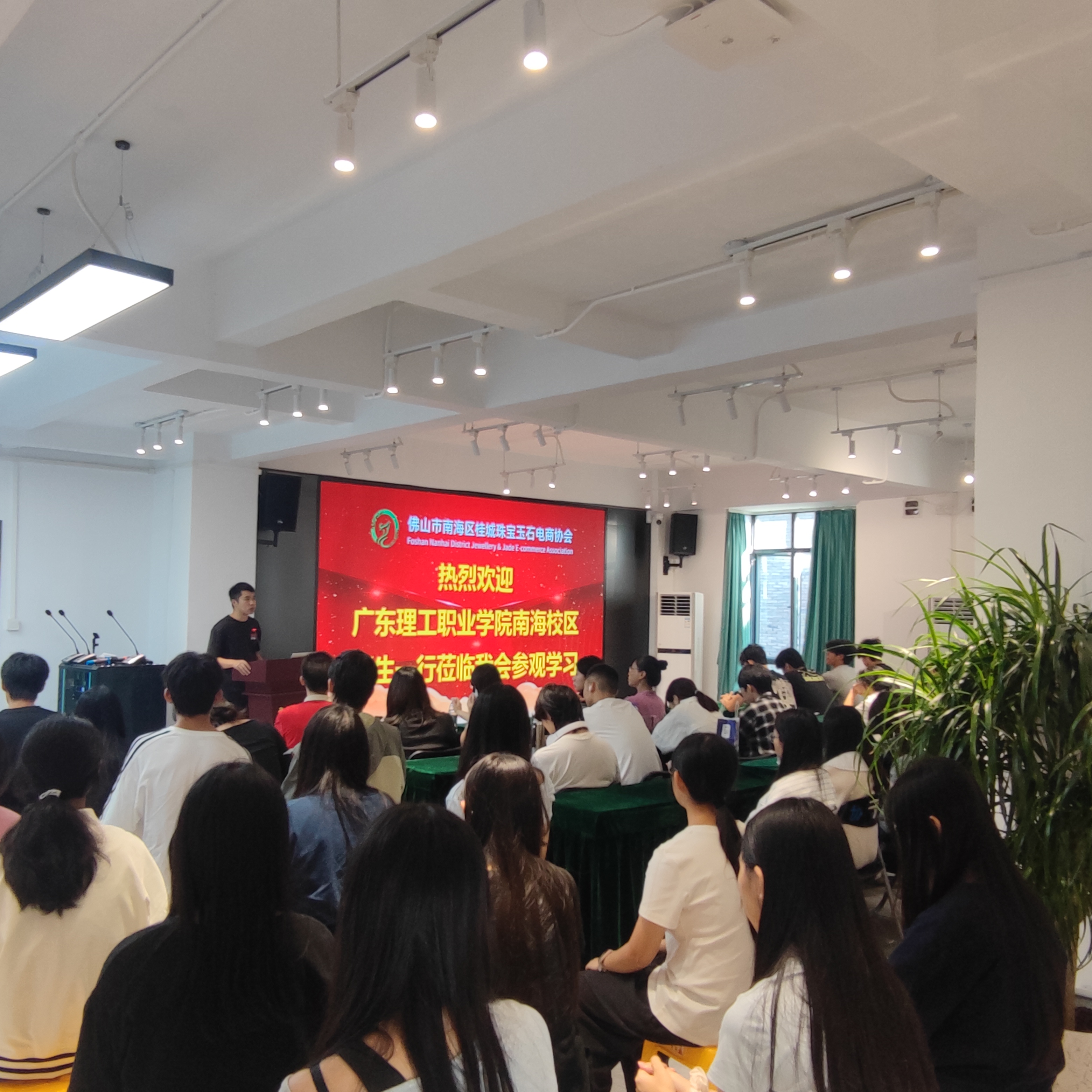 第三站,师生们来到了桂城珠宝玉石电商协会,协会副秘书长苏海明先生为师生们详细介绍了协会运行模式、平洲快手核心基地的运营情况,并展示了优秀直播商家的风采。随后,协会结合行业实操经验,为在场学生开展了玉器主播专题培训,分享主播必备技能与行业技巧。