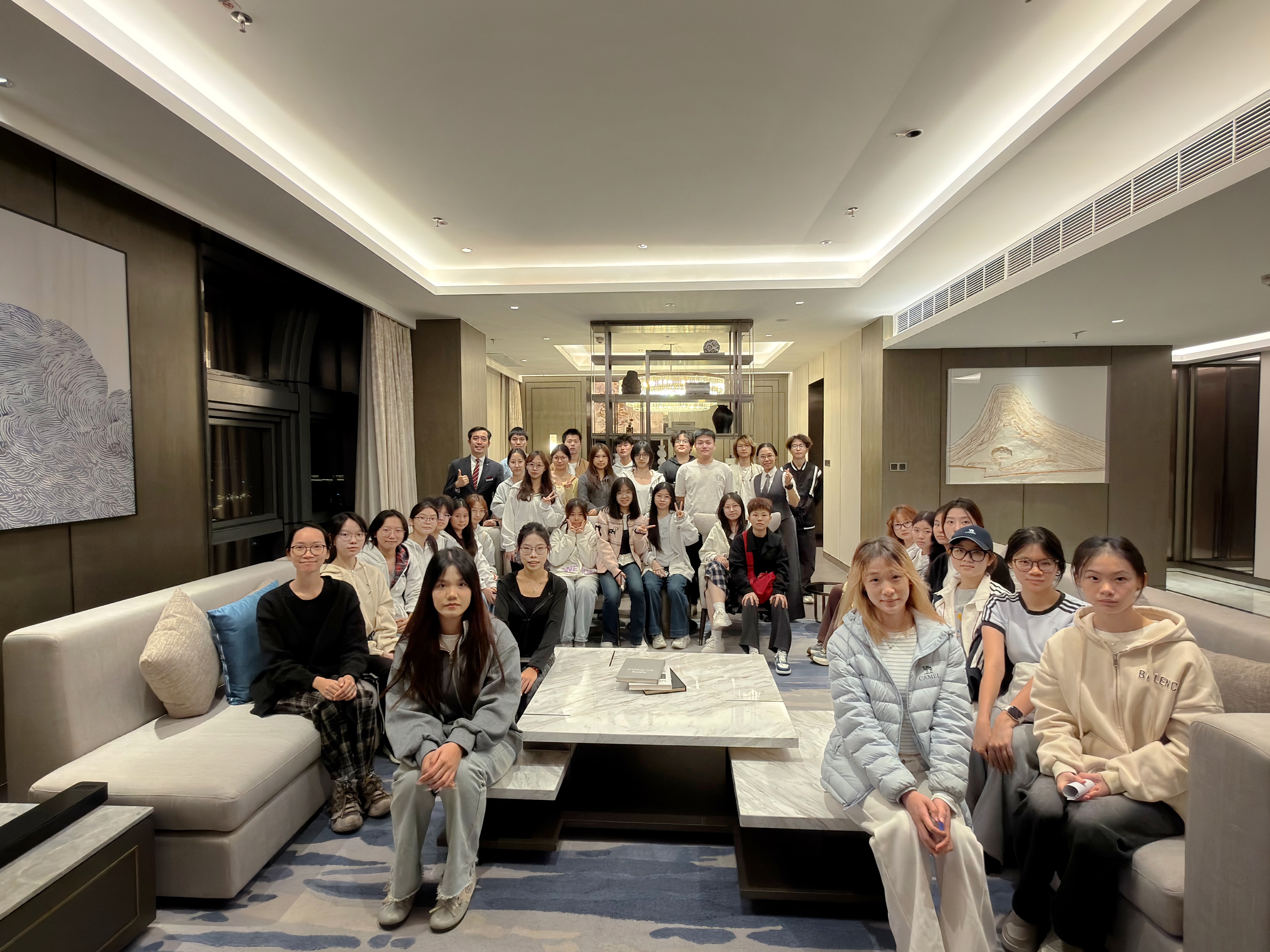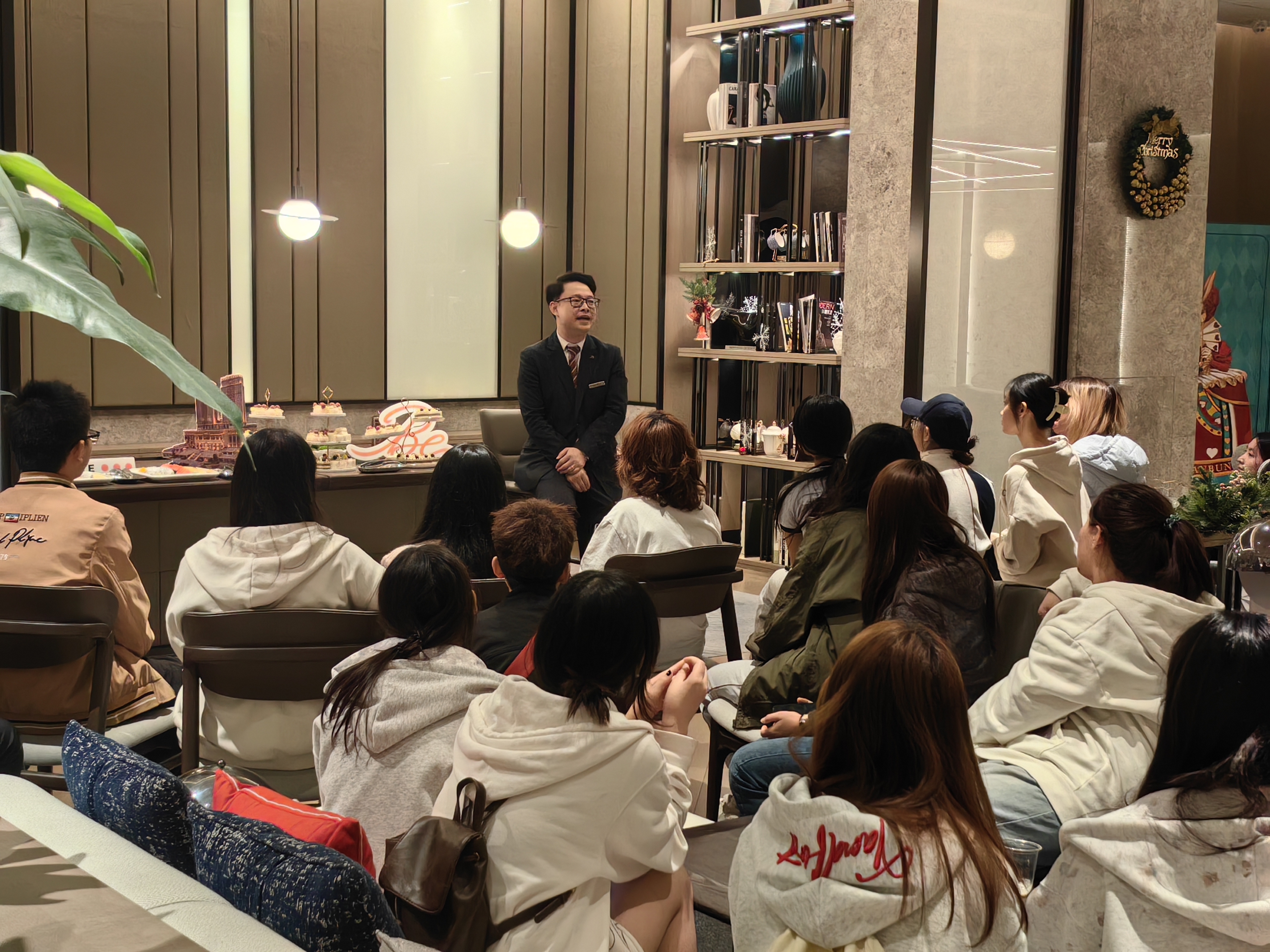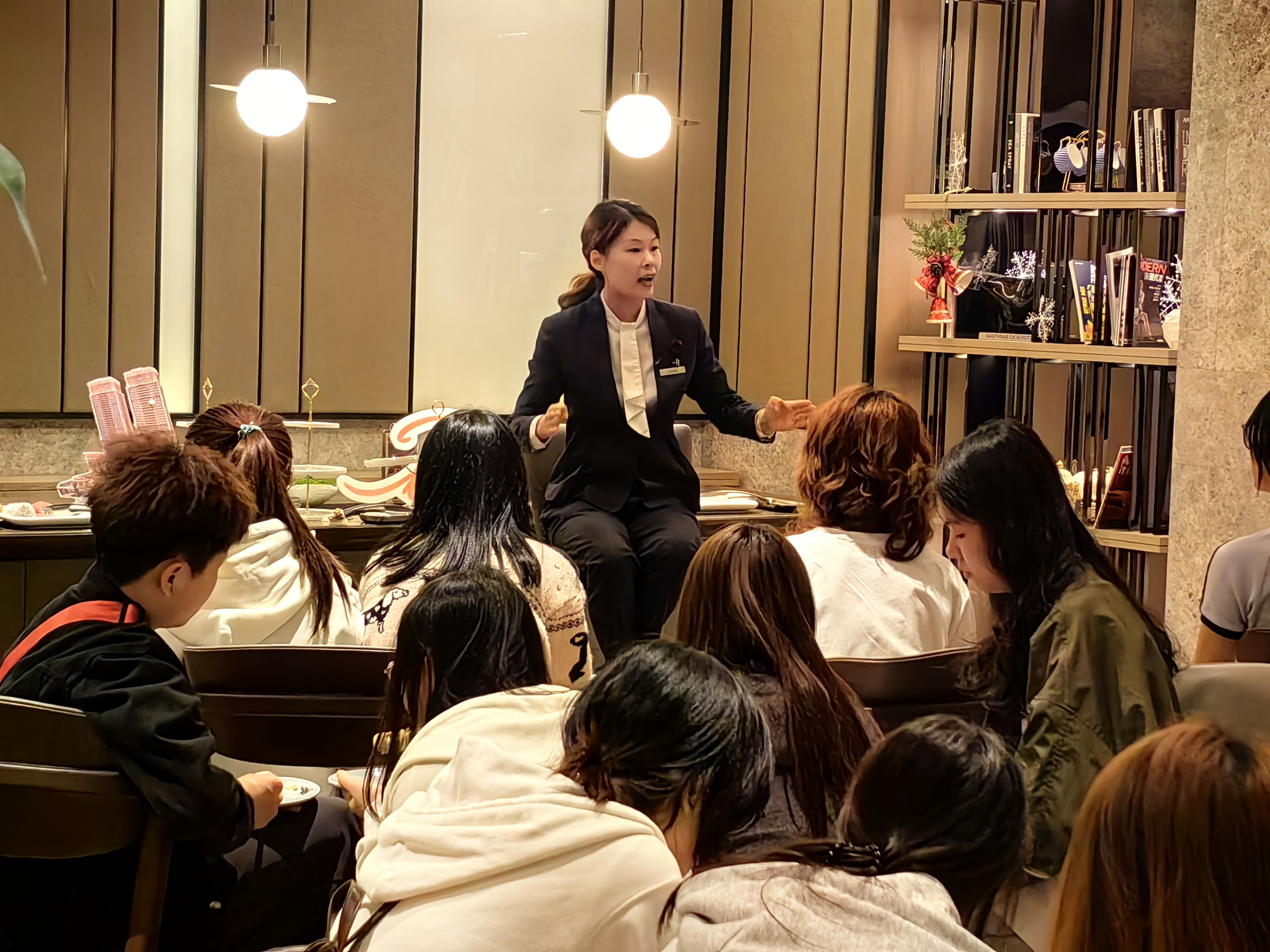2025年12月9日晚上,校企共建的佛山万豪酒店公共实训中心,举办了以“职耀人生,工匠之师”为主题的职业成长分享沙龙。我校酒店管理与数字化运营专业学生社团“酒水队”的34名队员,在社团指导老师丁颖的带领下,参与了这场精彩的活动。