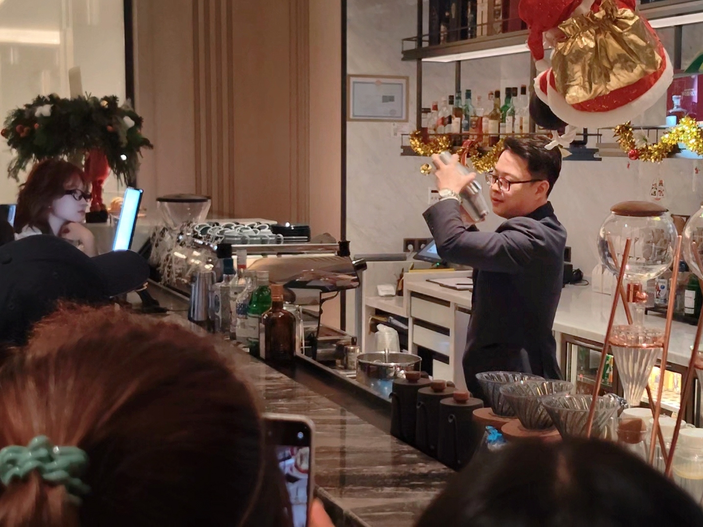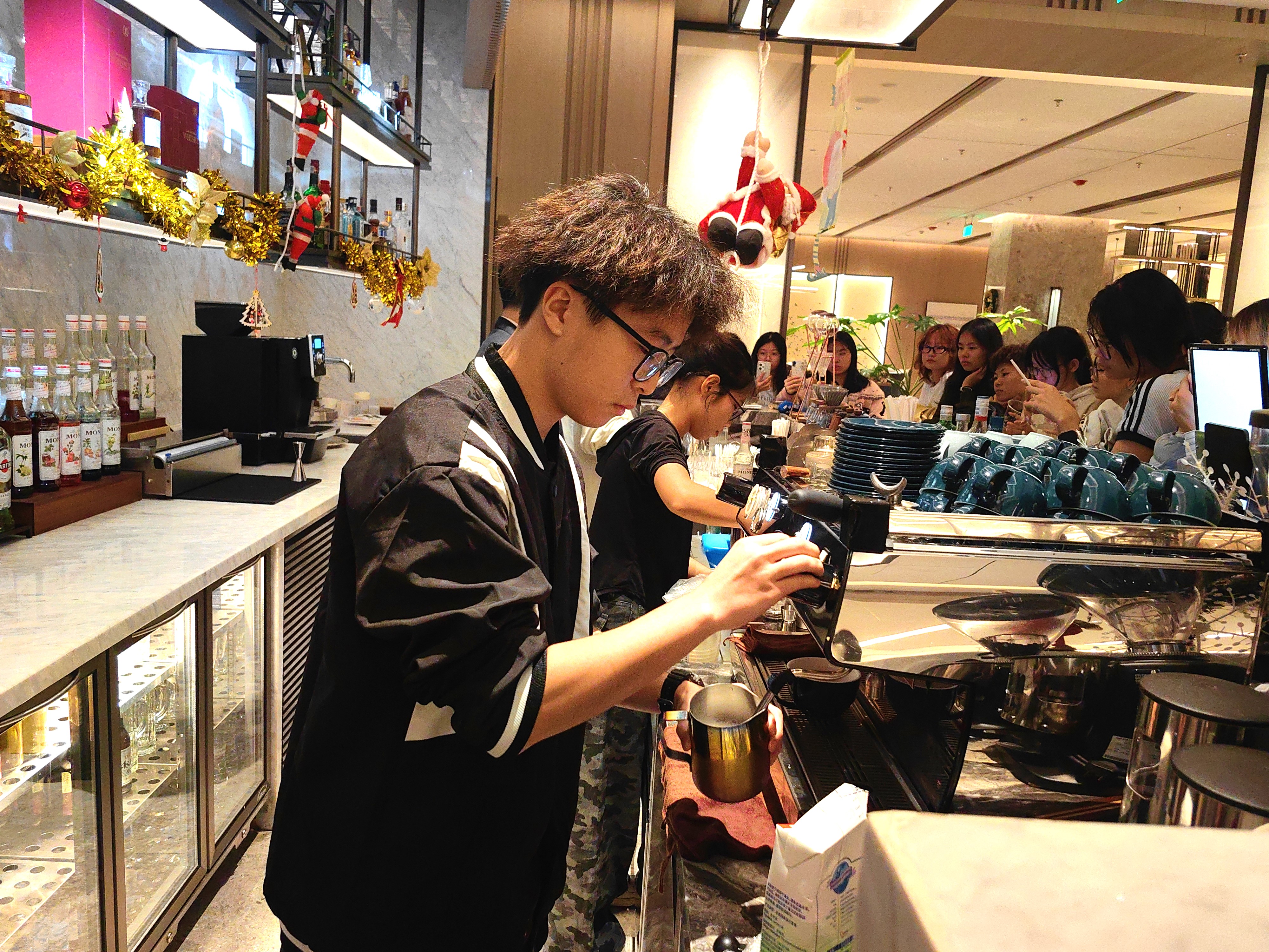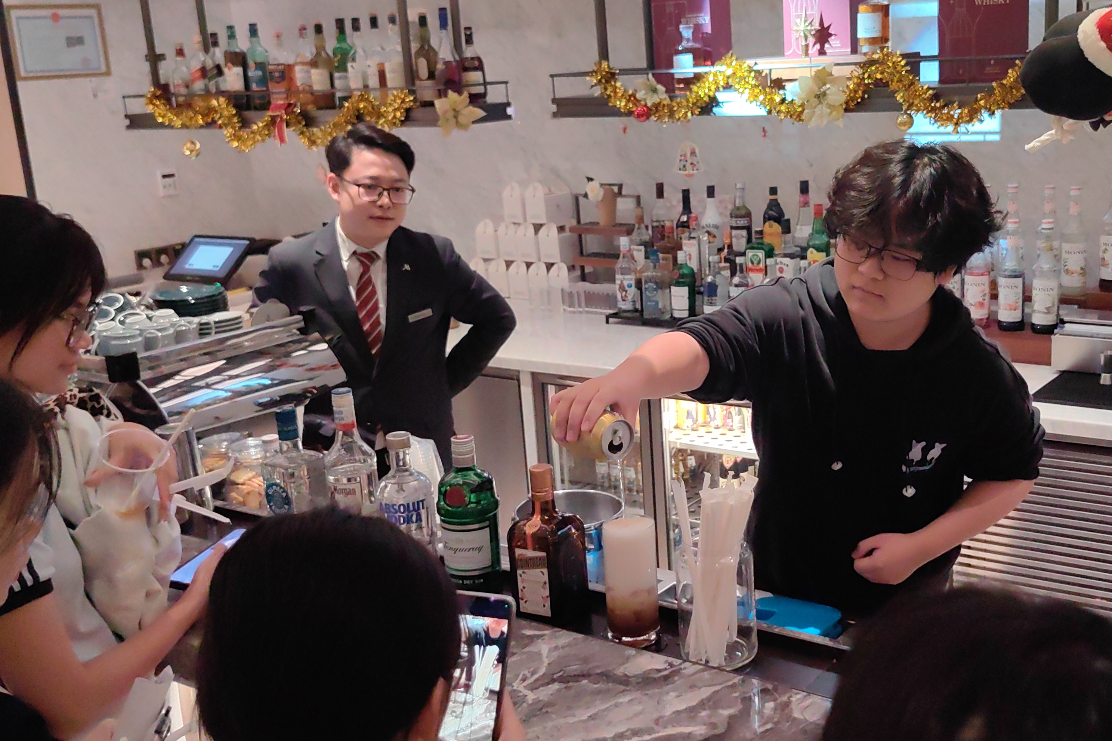 接下来,同学们汇聚在万豪酒店大堂吧,由大堂吧翁涛经理现场展示一款咖啡鸡尾酒,并讲解产品设计理念、制作技巧以及相关的酒水知识。多名同学在翁涛经理的耐心指导下亲身体验吧台酒水出品操作,成功制作了多款鸡尾酒,现场气氛热烈。