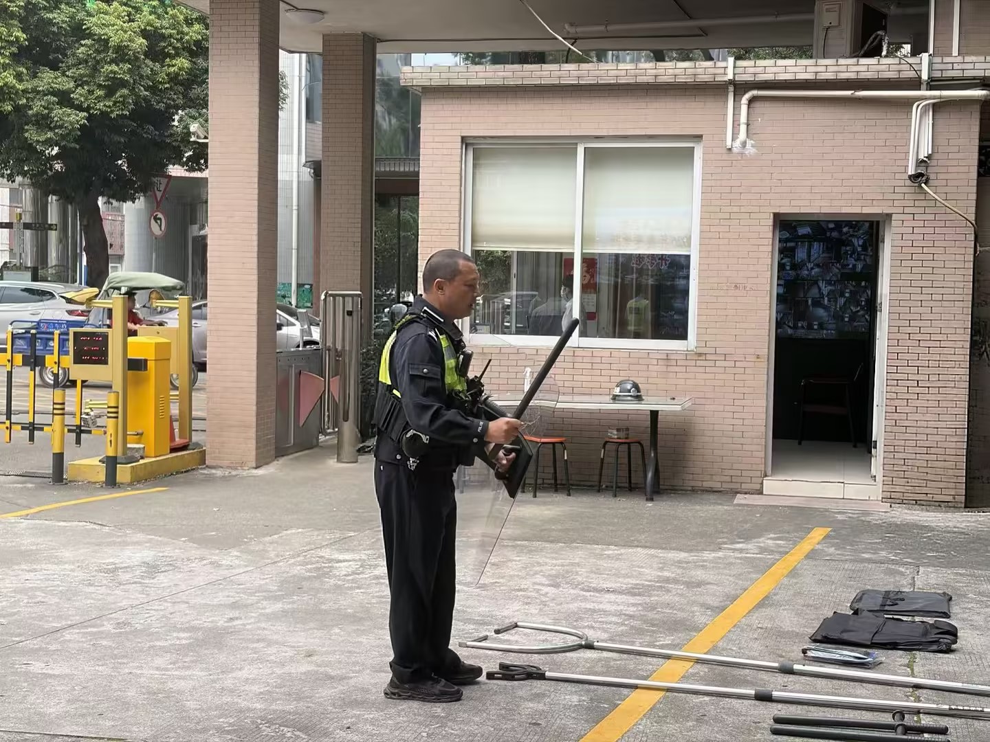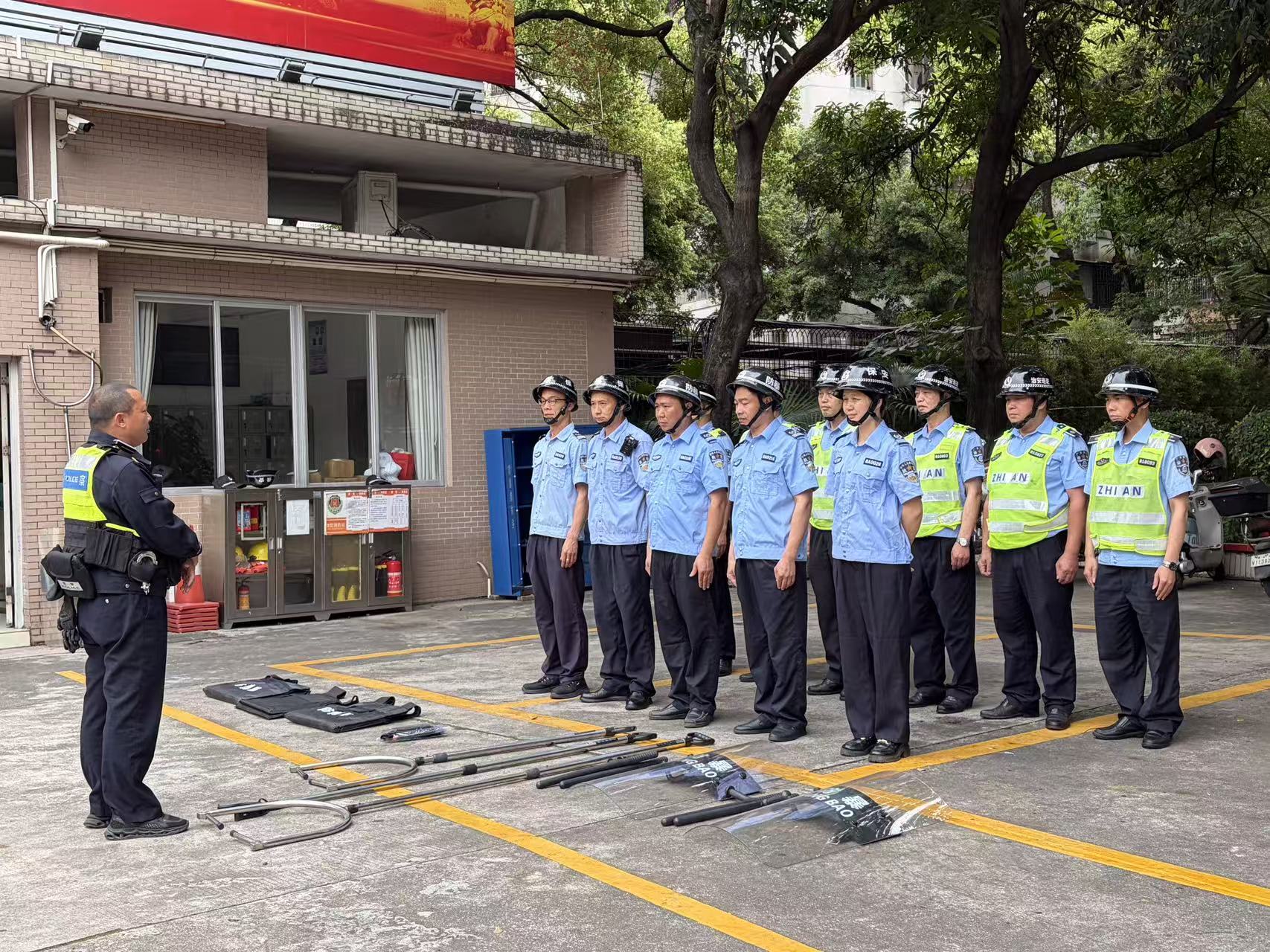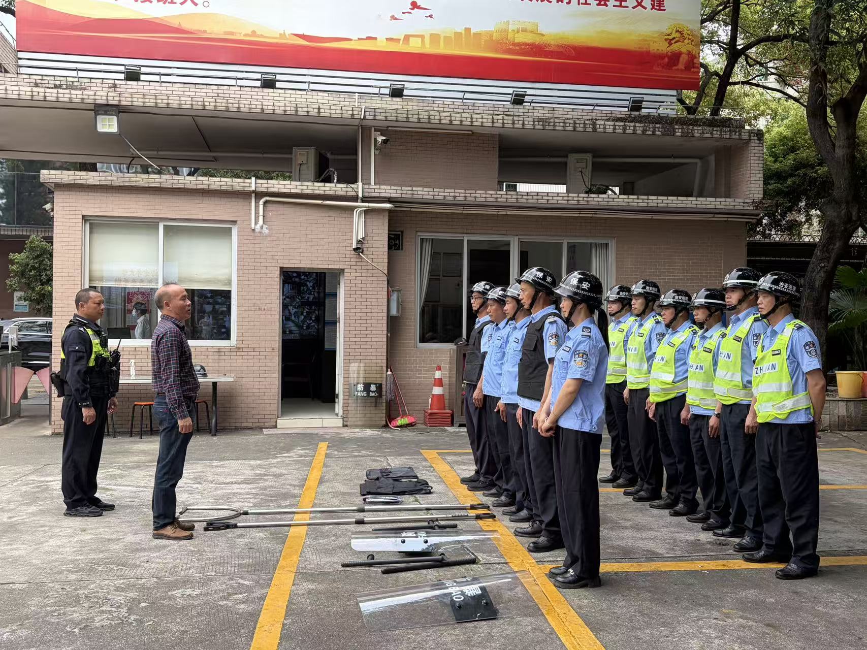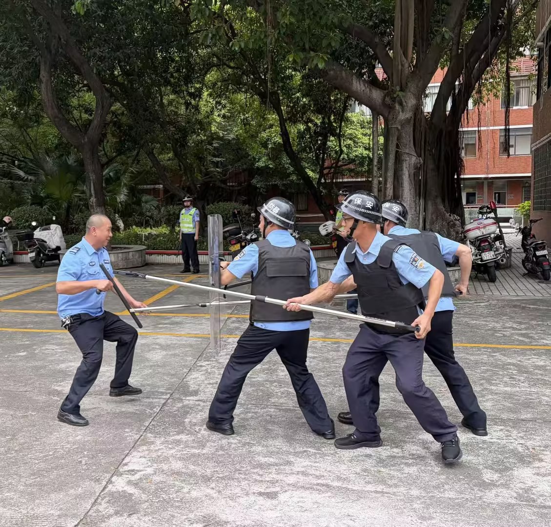 本次培训先由梁杰明警官开展防暴安全专项教学,他结合校园安全实际,细致讲解突发防暴事件处置流程。随后,梁杰明警官逐一示范防爆盾、防暴叉、警用警棍等器械的使用规范和操作技巧(图3)。理论讲解后,现场开展防暴应急模拟演练,模拟不法分子强行闯校场景,安保人员协同发力成功制服不法分子(图4)。梁杰明警官对演练进行现场点评,肯定快速响应能力的同时,指出阵型衔接、器械使用等方面的不足,并现场示范指导整改。