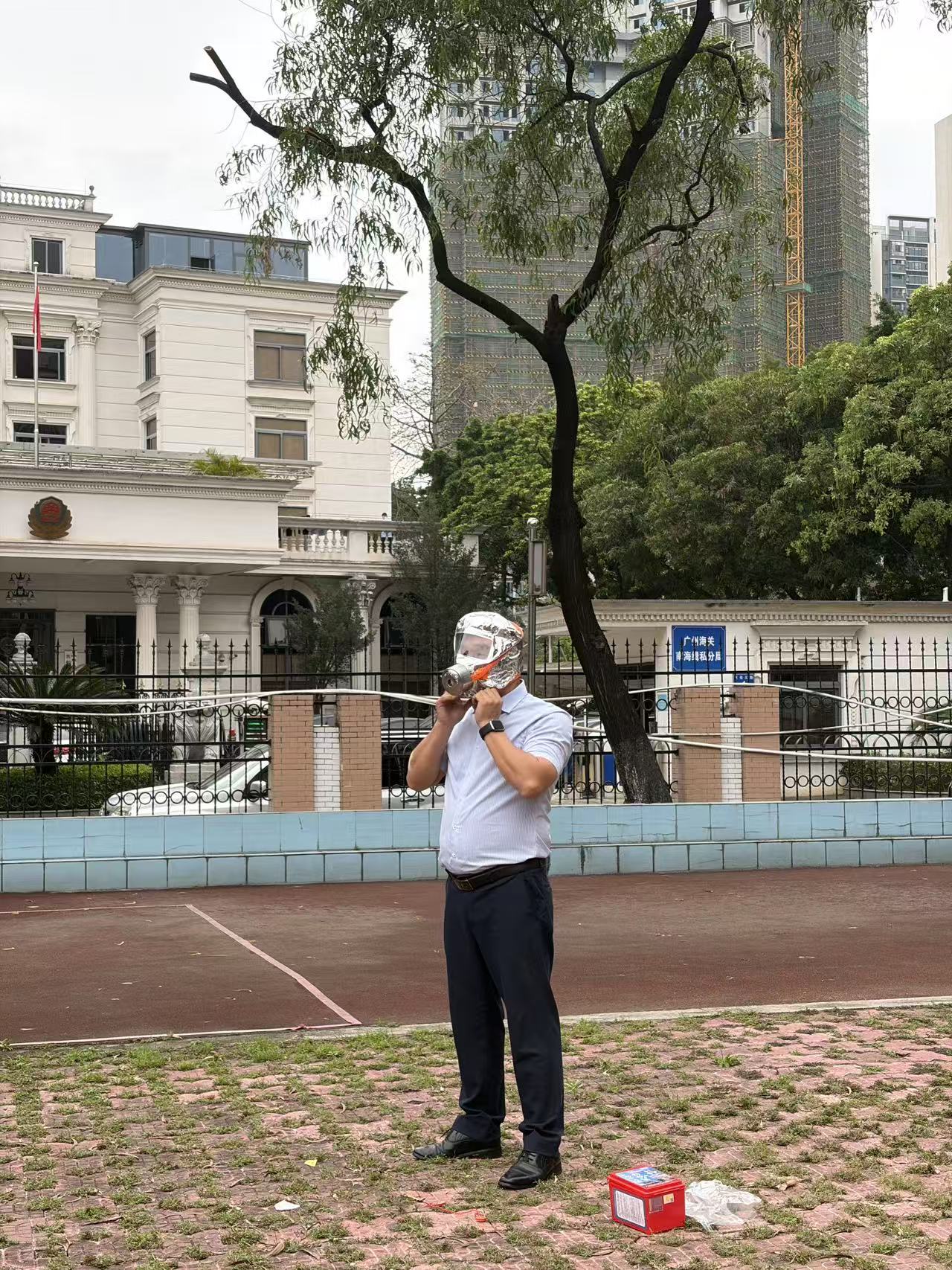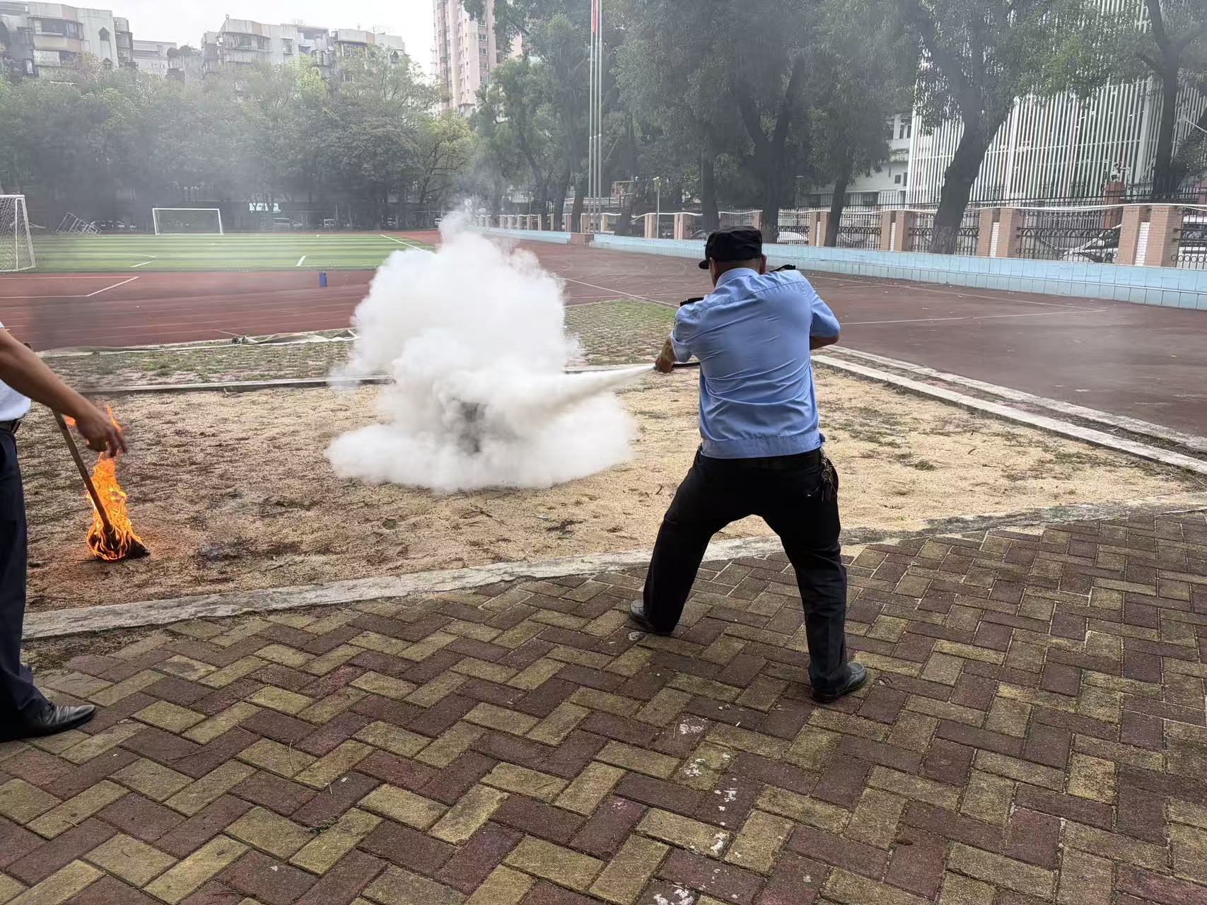 随后,物业公司王爱民经理开展消防安全专项培训,围绕干粉灭火器、过滤式消防自救呼吸器、消防水带等常用消防器材,结合校园消防实际讲解实操技巧(图5)。理论教学后,现场组织灭火实操演练,工作人员在防火桶内模拟火情,参训安保人员依次使用干粉灭火器规范操作(图6),快速高效扑灭明火,切实将理论知识转化为实战技能。