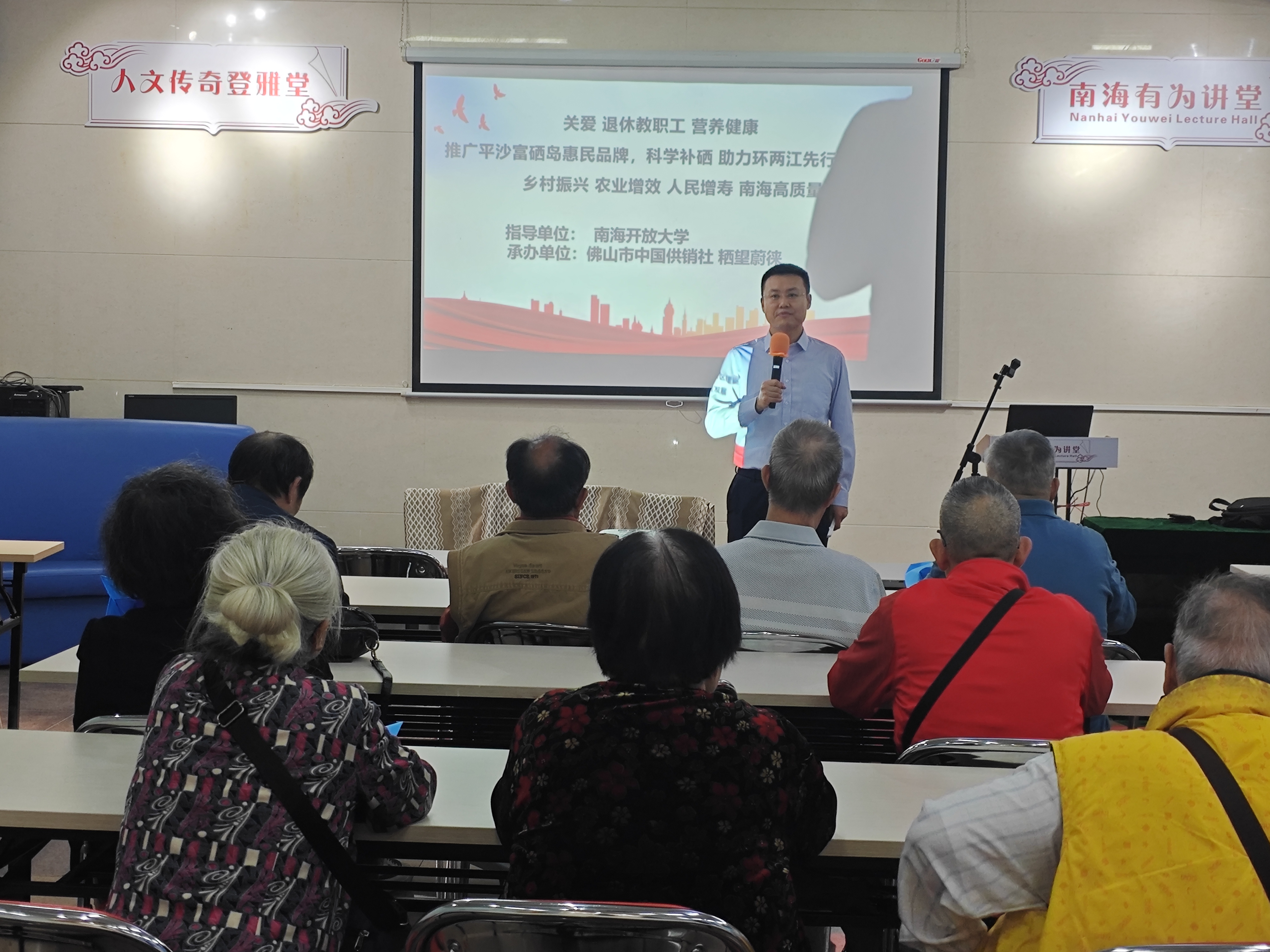 活动伊始,平沙岛富硒种植技术负责人、佛山市中国供销社粞望蔚徕健康科技公司总经理计凯杰为退休教职工带来了一场深入浅出的科普讲座。他详细讲解了硒元素在增强免疫力、抗氧化、延缓衰老等方面的关键作用,并结合平沙岛富硒农产品的检测数据,让退休教职工直观感受到了富硒农产品的健康价值。讲座内容丰富、专业且通俗易懂,赢得了退休教职工的阵阵掌声。讲座结束后,粞望蔚徕健康科技公司为每位退休教职工精心准备了平沙岛富硒农产品作为伴手礼,包括富硒胡萝卜、富硒燕麦胚芽等。