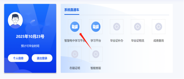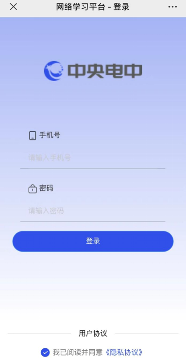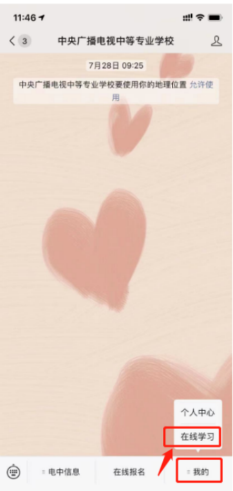 1. 在微信搜索“中央广播电视中等专业学校”公众号,点击:我的-在线学习;