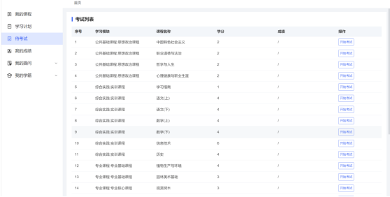 13.在左侧“待考试”模块,可以看到目前需要考试的科目、学分、成绩等内容。