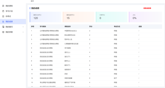14.在“我的成绩”板块,可以看到自己的成绩以及学分、占比等信息。