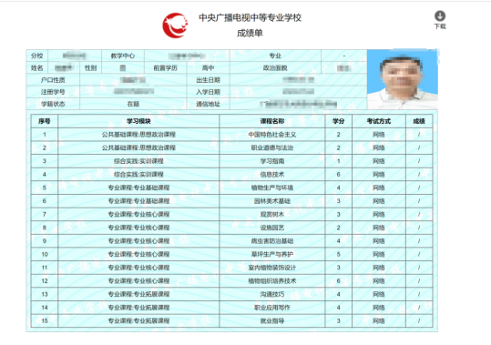 在该界面点击右上角“查看成绩单”即可查看到成绩单具体信息,再次点击“下载”则可获取电子版成绩单。