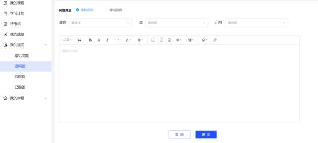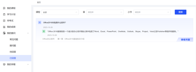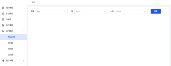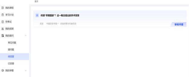 15. 在左侧“我的提问”板块,可以对某一章节进行提问,常见问题、待回答、已回答的问题都将出现在该页面。